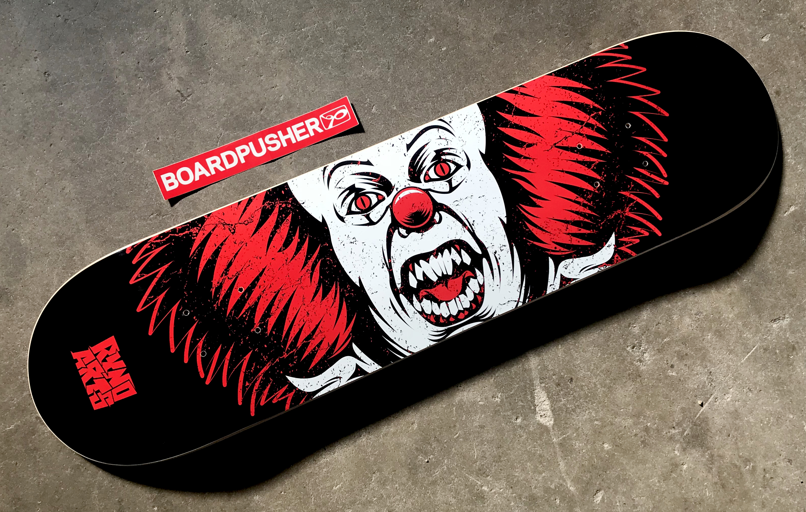 Ryan M. Genovese, or Rynoarts, creates some of our favorite pop culture reference designs that come through our presses. We really like this reimagining of Pennywise which is why we made it today’s BoardPusher.com Featured Deck. Different sizes with this graphic, as well as a few other skateboards by Ryan, are available at BoardPusher.com/shop/rynoarts.